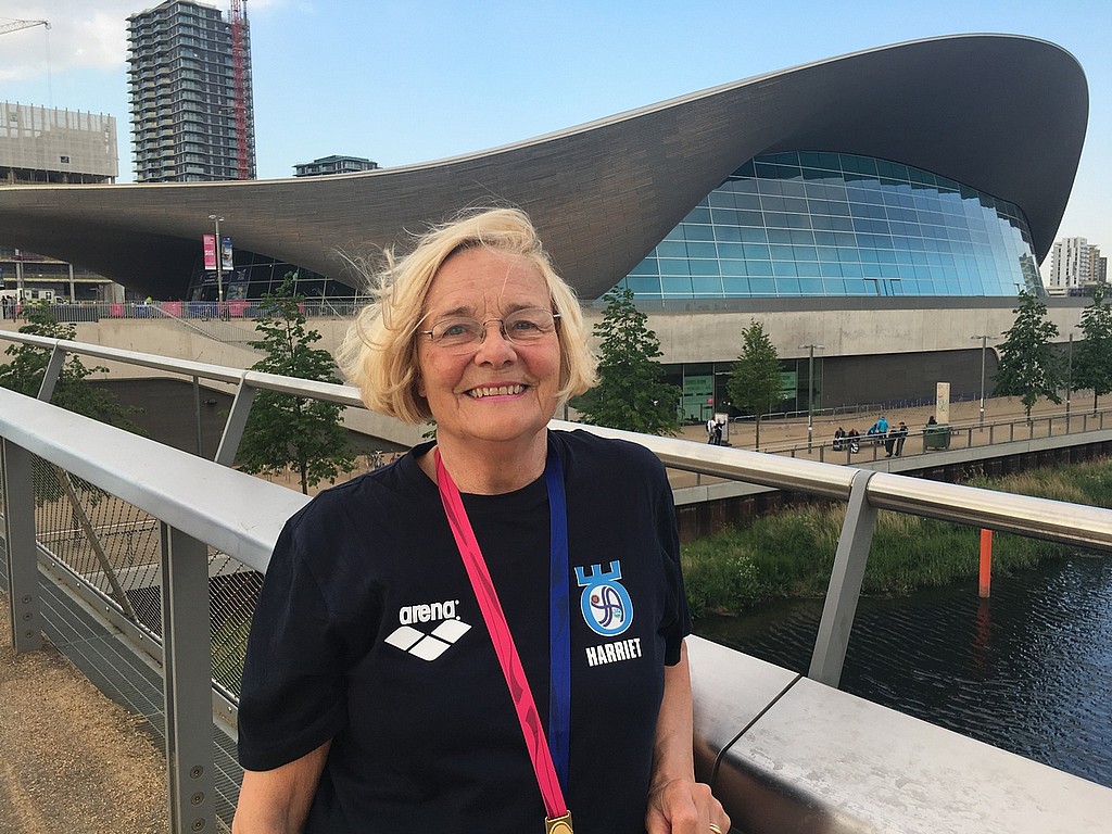 Harriet Bure, Örebro Simallians, simmade hem EM-guldet på 100 meter fjäril i klassen 70-74 år och silver på 50 fjäril.